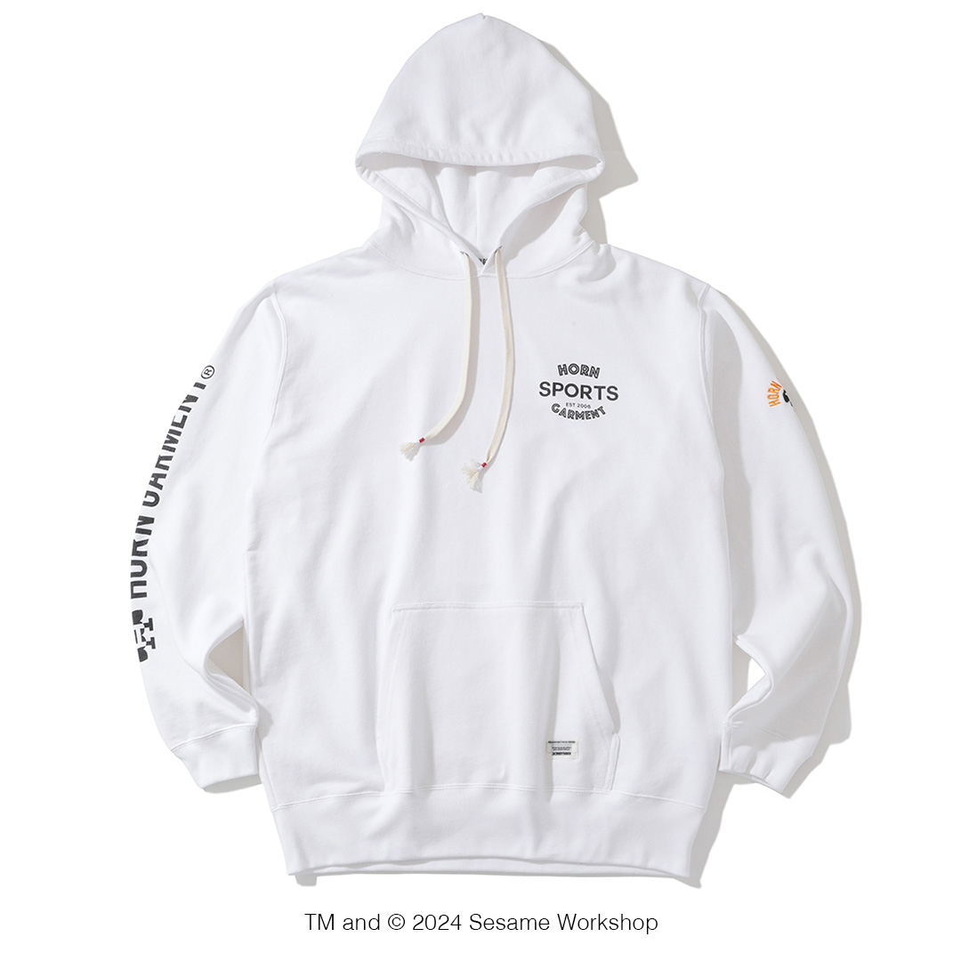 ユニセックスで着用可能なコラボフーディー。左胸と両袖にブランドアイコンを刺繍し、背面にはストリートテイストに仕上げたセサミアートのキャラクターグラフィックをプリント。吸水性の高い裏パイル素材で、肌触りも抜群です。