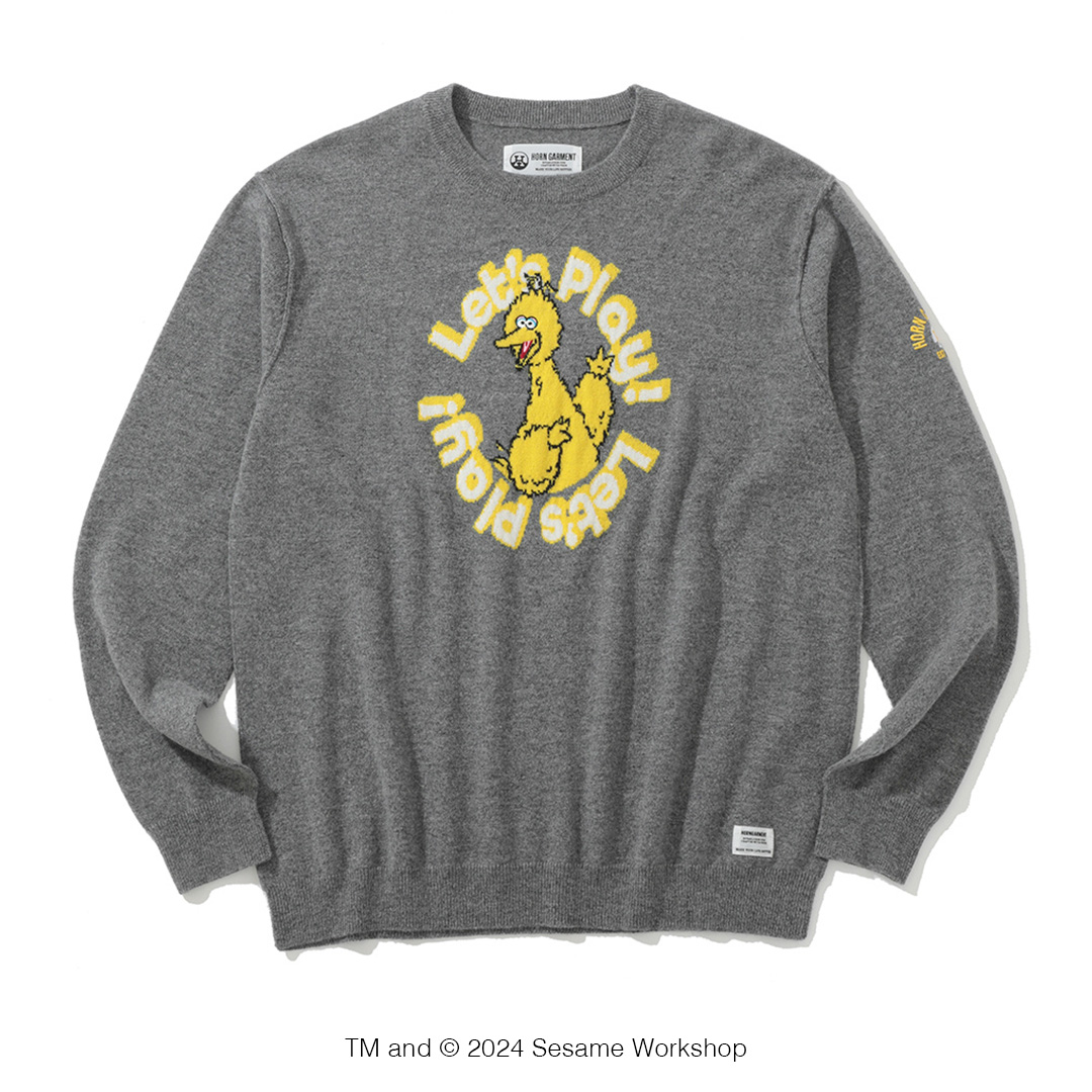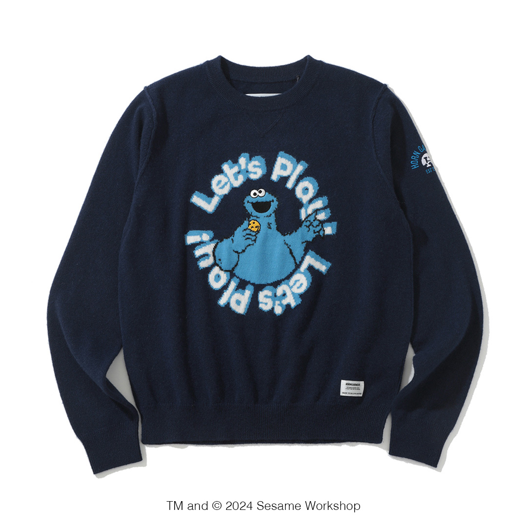 『セサミストリート』とのコラボニット。上質なカシミヤを使用し、 フロントにはジャガードでキャラクターが編み込まれたキャッチーなデザイン。左袖にはブランドアイコンの刺繍を施し、程よいゆとりのレギュラーシルエットで上品かつ快適な1着です。