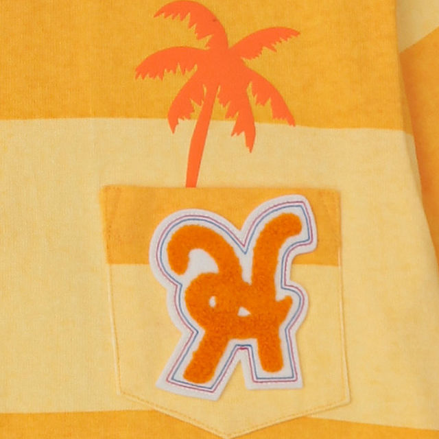太ボーダーをプリントした天竺素材のポロシャツ。今シーズンのテーマ「VIVA CALIFORNIA!」をイメージしたカラーリングで、胸ポケットにはHORN GARMENTのロゴ”H”ワッペン、さらにポケットの中から伸びたような手描きパームツリーをプリントしています。